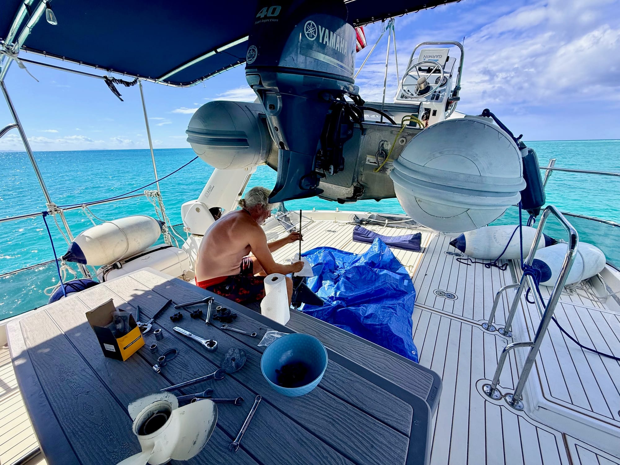 After the final midnight horn chorus of 200 boats competing to make the most noise…plus some fireworks and music till the wee hours—we fled north to Anegada. Beautifully remote, quiet and exposed. Pink-sand perfect. Which is exactly where our dinghy motor chose to stage a full emotional meltdown. Our dinghy, Moonbeam, is far more important than a car. When a car breaks down you Uber or maybe even walk. When Moonbeam breaks down, you regret not taking high school swim lessons more seriously and wonder where exactly to stash your husband for his frequent time-outs.